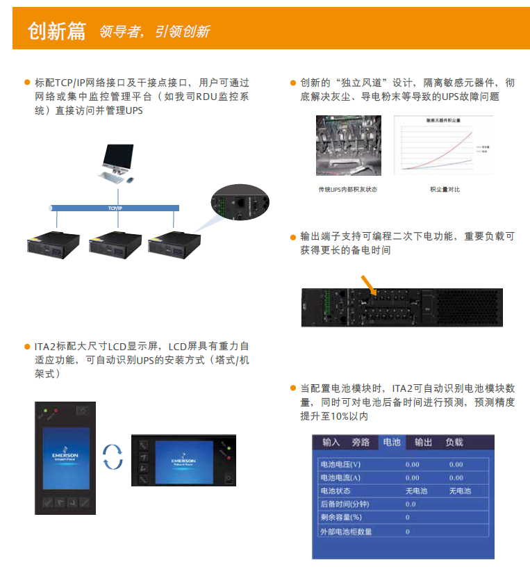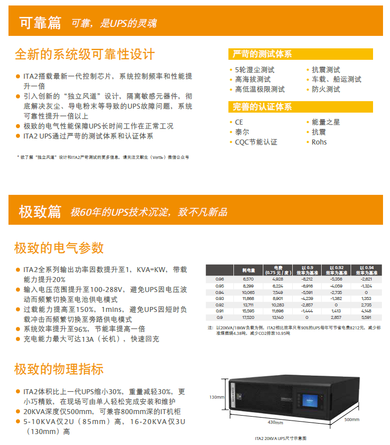 ITA2系列UPS是艾默生網(wǎng)絡(luò)能源有限公司憑借60年的UPS設(shè)計(jì)和制造經(jīng)驗(yàn),針對(duì)互聯(lián)網(wǎng)時(shí)代下市場提出的新需求而重磅推出的新一代小功率機(jī)架式UPS產(chǎn)品。ITA2系列UPS目前發(fā)布的容量為5-20KVA,它采用最新一代控制芯片,可以為系統(tǒng)提供更優(yōu)的控制頻率和性能,可以極大地提高負(fù)載和輸入源的適應(yīng)性。ITA2采用全新的系統(tǒng)設(shè)計(jì),極大地提升了產(chǎn)品可靠性并進(jìn)一步優(yōu)化了系統(tǒng)效率。ITA2應(yīng)用大量創(chuàng)新的設(shè)計(jì),可以靈活地應(yīng)用在各類場合。是客戶不間斷供電的首選產(chǎn)品,更是業(yè)界的新標(biāo)桿。