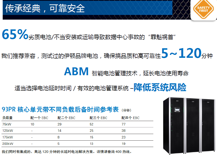 93PR模塊化UPS及關(guān)鍵電力保護(hù)系統(tǒng)采用當(dāng)今先進(jìn)的及伊頓專利的電力電子技術(shù),由伊頓全球團隊傾心打造,符合高可靠性軍用等級要求,綜合設(shè)計,系統(tǒng)測試和驗證的系統(tǒng),減少大量因電池等部件導(dǎo)致的使用故障,確保客戶業(yè)務(wù)持續(xù)運行。采用伊頓專利的三電平技術(shù),雙變化效率高達(dá)96.5%,交流直供模式下效率大于99%,有效降低客戶總體擁有成本(TCO)??梢匀鏉M足從網(wǎng)絡(luò)配線間、中小數(shù)據(jù)中心到大型數(shù)據(jù)中心的應(yīng)用及自動化或醫(yī)療等應(yīng)用場所的電力保障要求。