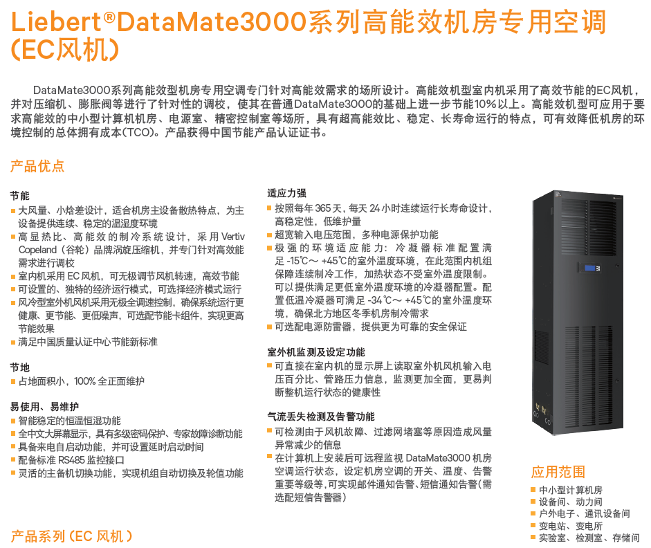Vertiv Liebert DataMate3000 系列高能效型機房專用空調(diào)專門針對高能效需求的場所設計,比普通機房空調(diào)進一步節(jié)能10%以上??蓱糜谥行⌒陀嬎銠C機房、電源室、精密控制室等場所,具有超高能效比、穩(wěn)定、長壽命運行的特點,可有效降低機房的總體擁有成本(TCO)。