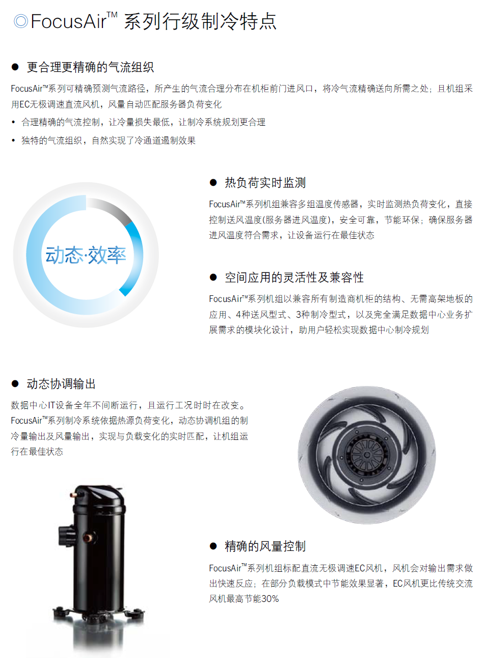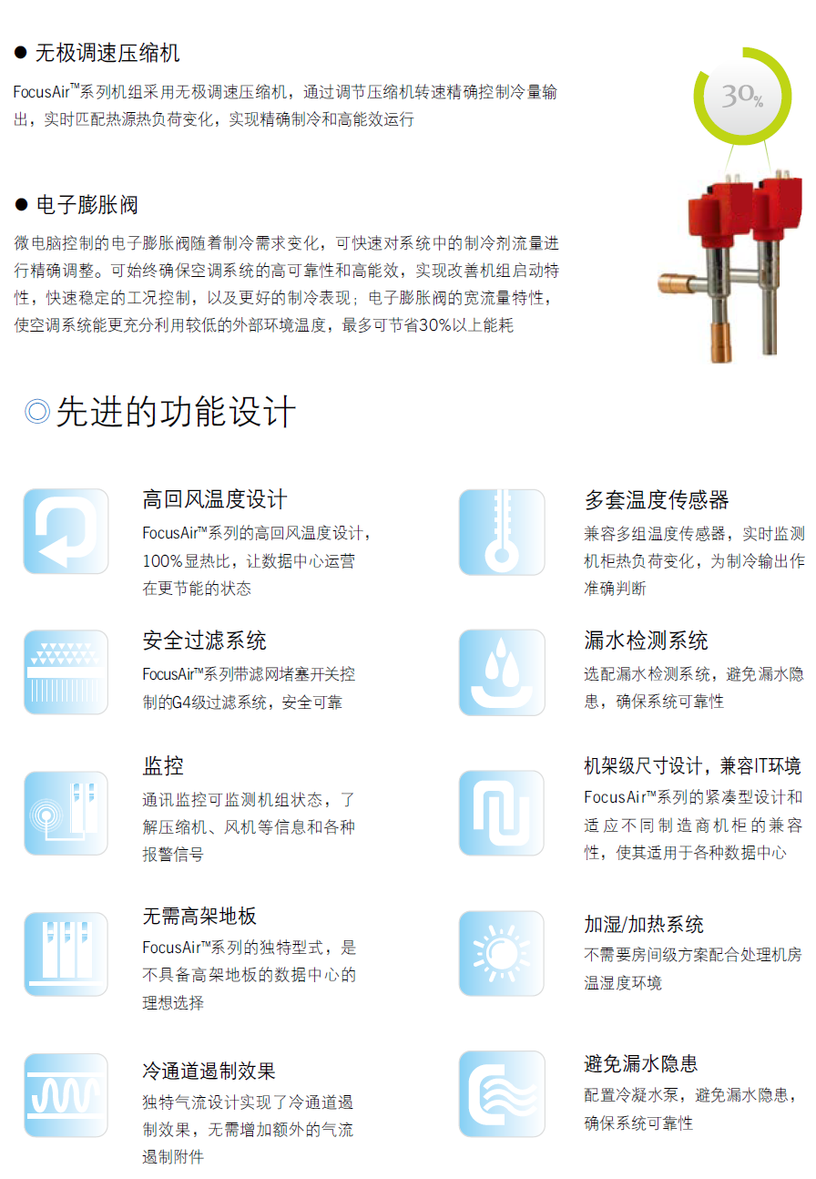 FocusAir系列行級(jí)精密空調(diào)是為新一代高熱密度數(shù)據(jù)中心機(jī)柜特定制冷需求而推出的解決方案。通過(guò)緊貼熱源的設(shè)計(jì),直接處理服務(wù)器排出的熱風(fēng),縮短氣流路徑,防止冷熱風(fēng)交匯、氣流損失降到最低,消除氣流及制冷的不確定性。通過(guò)對(duì)熱源負(fù)荷變化的實(shí)時(shí)監(jiān)測(cè),并精確調(diào)節(jié)制冷輸出量及風(fēng)機(jī)輸出量,使制冷量和送風(fēng)量精確且可預(yù)測(cè),實(shí)現(xiàn)更有針對(duì)性的精確制冷,完美解決數(shù)據(jù)中心高密度散熱問(wèn)題,保障關(guān)鍵設(shè)備全年365×24小時(shí)不間斷高效可靠運(yùn)行。