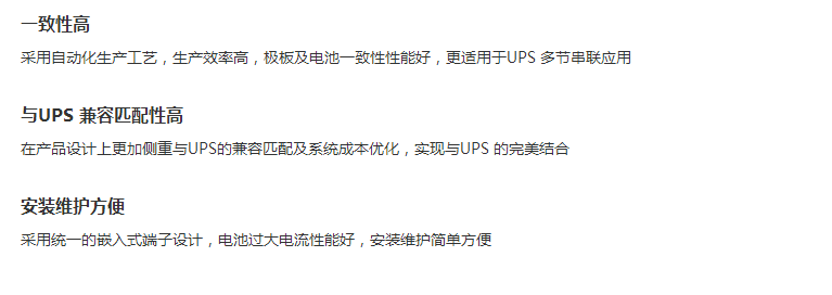 山特電子(深圳)有限公司針對UPS行業(yè)應用需求,特別推出了城堡C12V系列閥控式鉛酸蓄電池。城堡C12V系列電池產(chǎn)品采用先進的技術和生產(chǎn)工藝,在產(chǎn)品設計、技術指標和工藝控制上更加側(cè)重于與UPS的兼容匹配和系統(tǒng)優(yōu)化:與同等型號電池對比,山特城堡C12V系列電池可以提供更長的浮充壽命和更強勁的放電特性,更適合UPS應用,是UPS備用電池領域的首選產(chǎn)品。