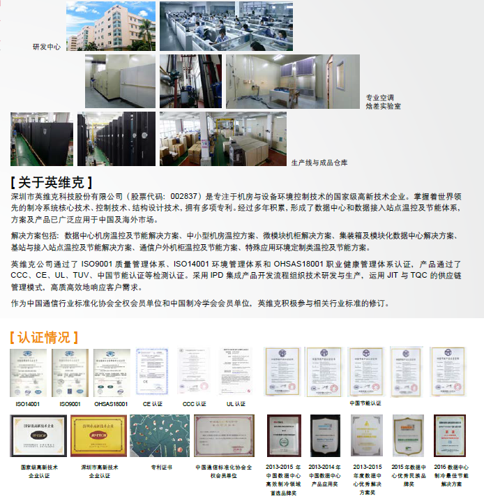 深圳市英維克科技有限公司是專注于機房與設備環(huán)境控制技術(shù)的國家級高新技術(shù)企業(yè)。掌握著世界領(lǐng)先的制冷系統(tǒng)核心技術(shù)、控制技術(shù)、結(jié)構(gòu)設計技術(shù),擁有多項專利。經(jīng)過多年積累,形成了數(shù)據(jù)中心和數(shù)據(jù)接入站點溫控及節(jié)能體系,方案及產(chǎn)品已廣泛應用于中國及海外市場。